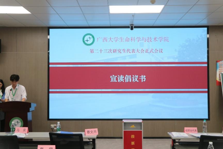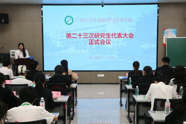 11月9日下午,我院第二十三次研究生代表大会正式会议在学院106室顺利召开。学院党委副书记、纪委书记覃文月,团委书记马奕,团委副书记贺超,学工组辅导员关家运,广西大学研究生会代表,兄弟学院研究生会代表以及我院各班级代表出席本次大会。大会由学院第二十二届研究生会执行主席卢晓敏主持。